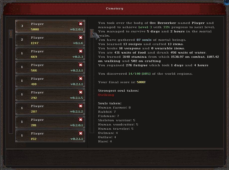 Hey guys, this time not only bunch of bugfixes, but a new feature - Cemetery, with extra information about your past runs, that were not available on the death screen. Added - Cemetery, available in t...
